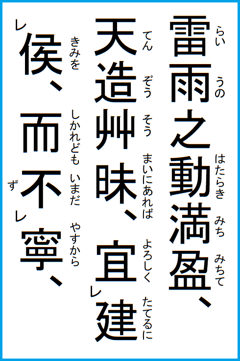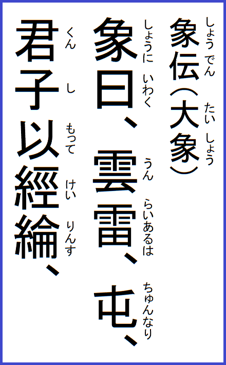 もし、震雷が上に上り、坎の雲が雨となって下に降る時は、この欝蟄の気も解き放たれて散り、雨の潤いも草木百物に充ち及ぶことになる。 また、下卦を内、上卦を外とすれば、坎は険難、震は動くだから、坎の険難の中で動き、未だその中から出られないことを示している。 また、合体の象を以って見るときは、九五の君は坎の険難の中に陥り、初九の侯が下に在って震の勢いを得た様子。 また、来往生卦法では、この水雷屯は水地比から来たものとする。 |