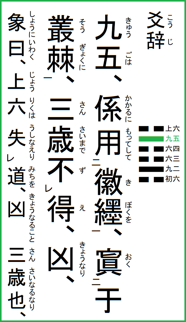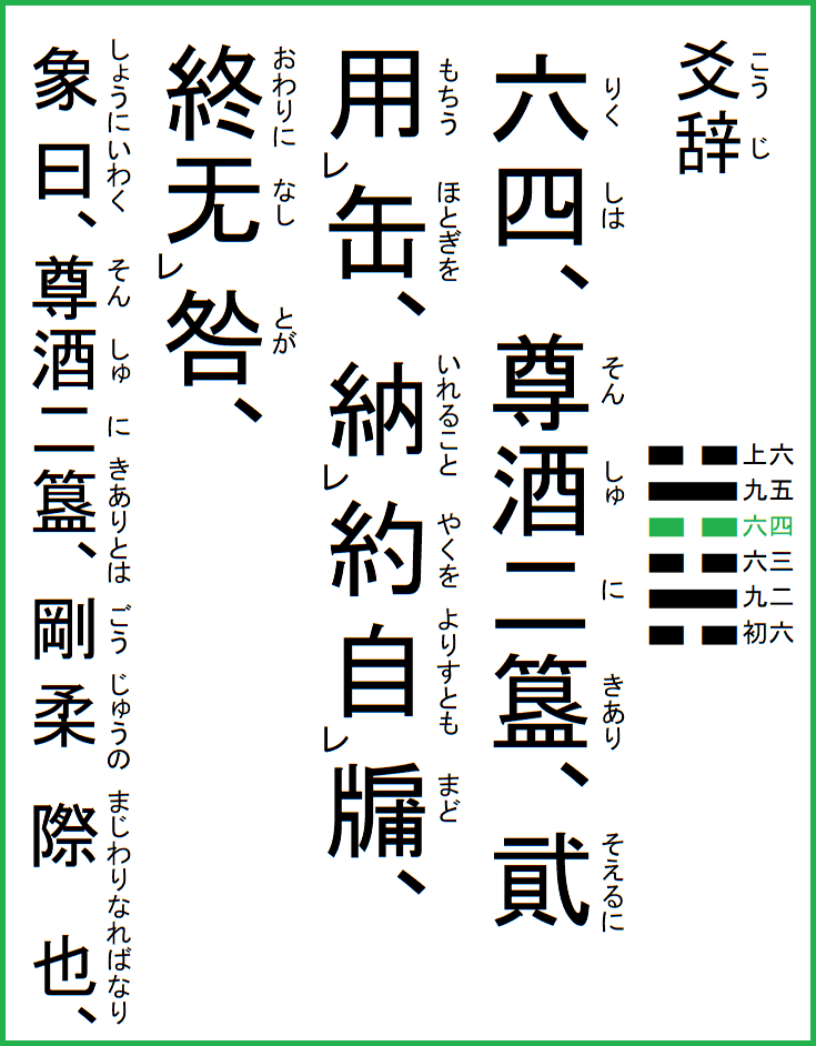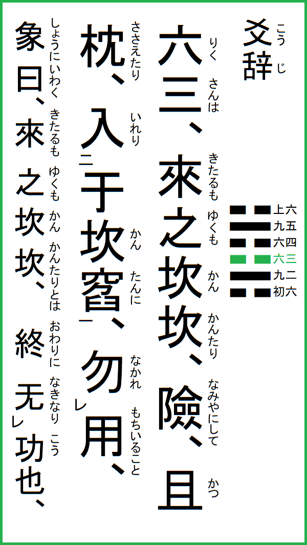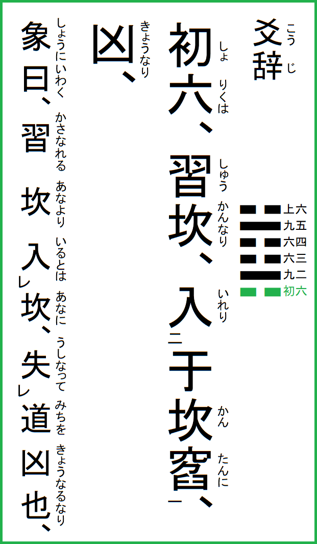 究極の易経解説 メニュー 01.乾為天 02.坤為地 03.水雷屯 04.山水蒙 05.水天需 06.天水訟 07.地水師 08.水地比 09.風天小畜 10.天沢履 11.地天泰 12.天地否 13.天火同人 14.火天大有 15.地山謙 16.雷地予 17.沢雷随 18.山風蠱 19.地沢臨 20.風地観 21.火雷噬嗑 22.山火賁 23.山地剥 24.地雷復 25.天雷无妄 26.山天大畜 27.山雷頤 28.沢風大過 29.坎為水 30.離為火 31.沢山咸 32.雷風恒 33.天山遯 34.雷天大壮 35.火地晋 36.地火明夷 37.風火家人 38.火沢睽 39.水山蹇 40.雷水解 41.山沢損 42.風雷益 43.沢天夬 44.天風姤 45.沢地萃 46.地風升 47.沢水困 48.水風井 49.沢火革 50.火風鼎 51.震為雷 52.艮為山 53.風山漸 54.雷沢帰妹 55.雷火豊 56.火山旅 57.巽為風 58.兌為沢 59.風水渙 60.水沢節 61.風沢中孚 62.雷山小過 63.水火既済 64.火水未済 |