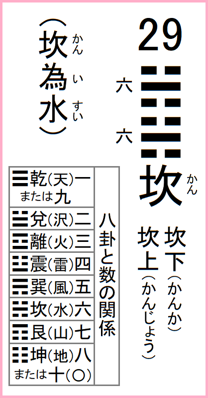 前の卦=28沢風大過 次の卦=30離為火 29坎為水 かんいすい「旧約聖書」ノアの洪水神話を構成する3卦(坎・離・咸)のひとつ。詳細はコチラ。 八卦の この卦は、八卦の |