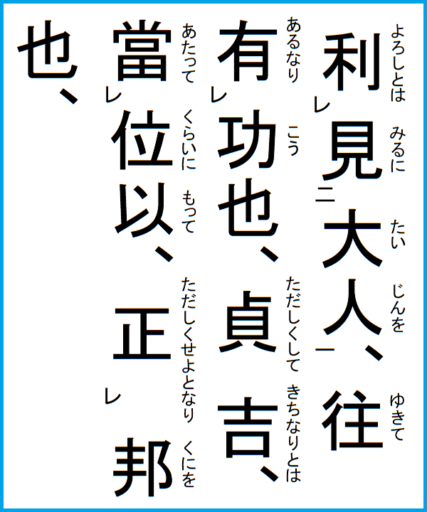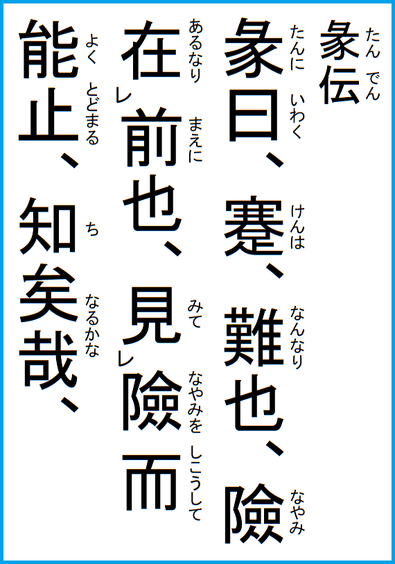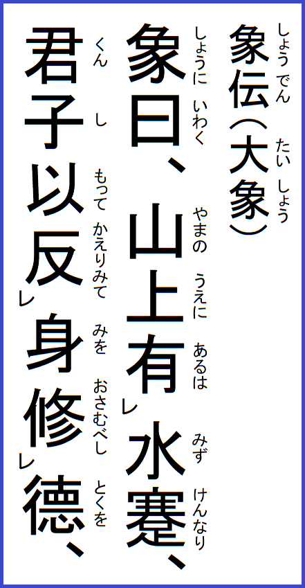 象に曰く、往くは蹇あり来たれば碩いなりとは、志、内に在ればなり、大人を見るに利ろしとは、以って貴きに従えよとなり、