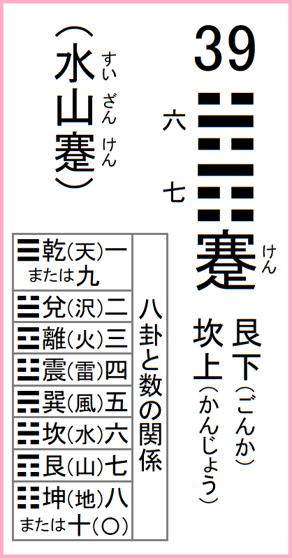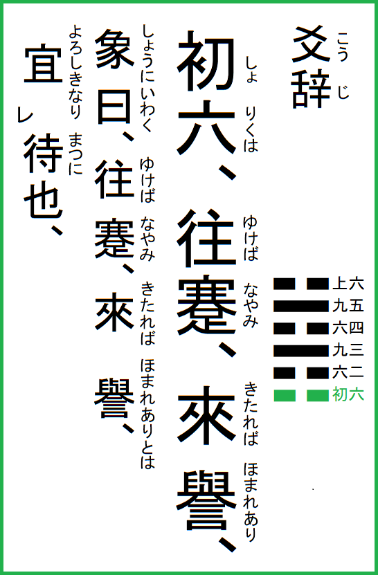 さらには、卦の初め、難(なや)みの初めに居るので、少しでも進み為すことがあるときには、その蹇難は益々深い方に向かう。