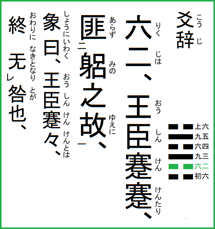 六二は、王臣蹇蹇たり、躬の故に匪ず、