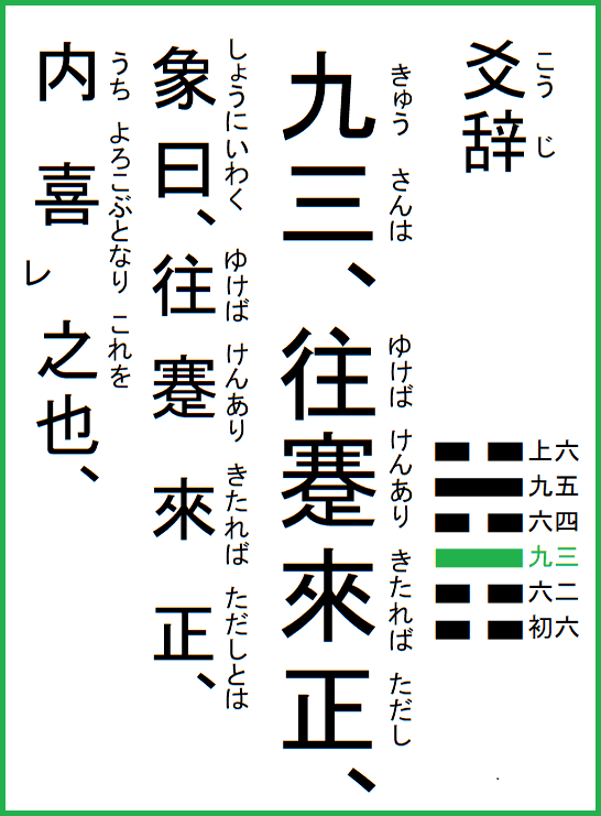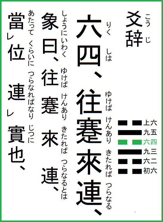 象に曰く、往けば蹇あり、来たれば連なるとは、位に当たりて実に連なればなり、