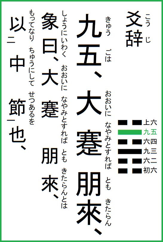 象に曰く、大いに蹇みとすれば朋来たらんとは、中にして節あるを以ってなり、
