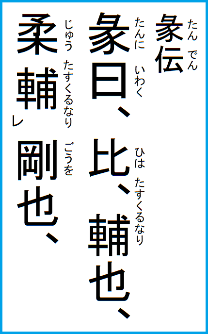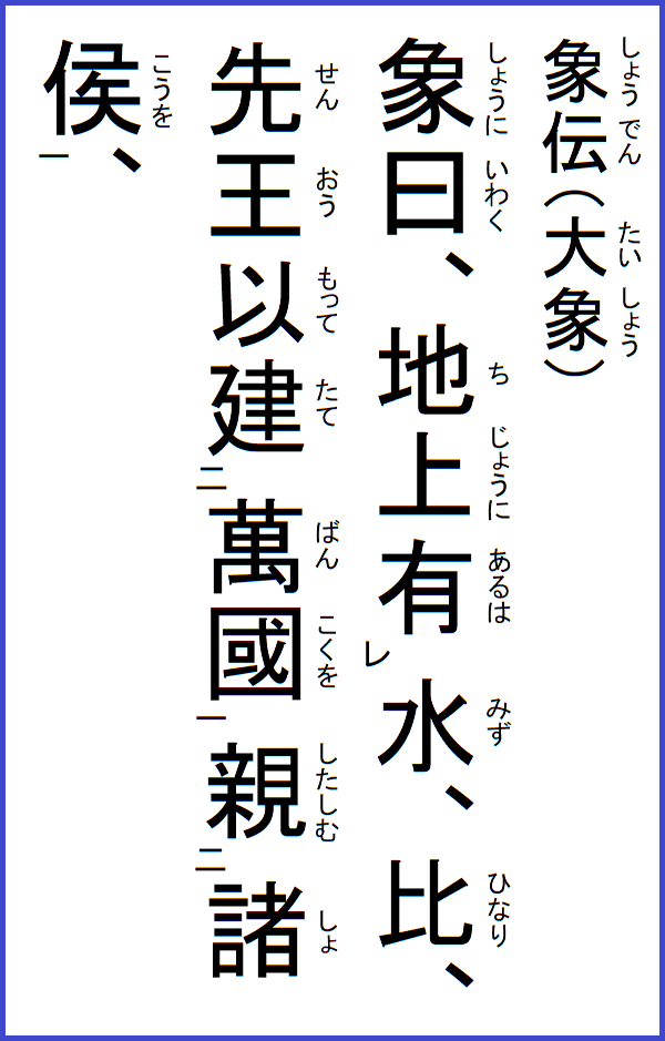 また、九五の爻を君とのみ取らず、ひろく天下の賢徳者とする意も込められていて、天下の賢者と親しんで己の及ばざるところを補い充たして君上に従うという義もある。