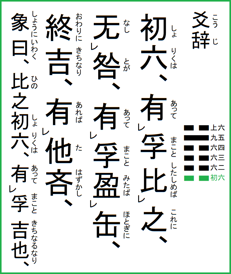 初六は、孚有って之に比しめば、咎无し、孚有って缶に盈たば、終わりに吉なり、他有れば吝し、