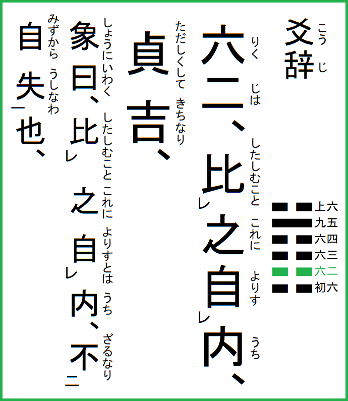 六二は、之に比しむこと内よりす、貞しくして吉なり、