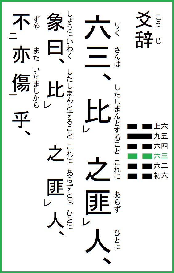 なおかつ六三の爻は、陰柔不才であるとともに不中不正である。