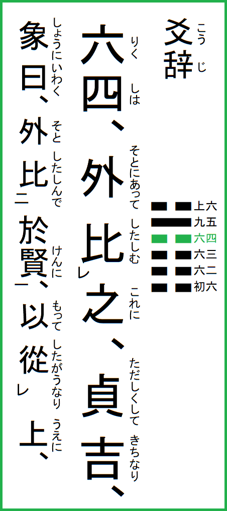 六四は、外にあって之に比しむ、貞しくして吉なり、