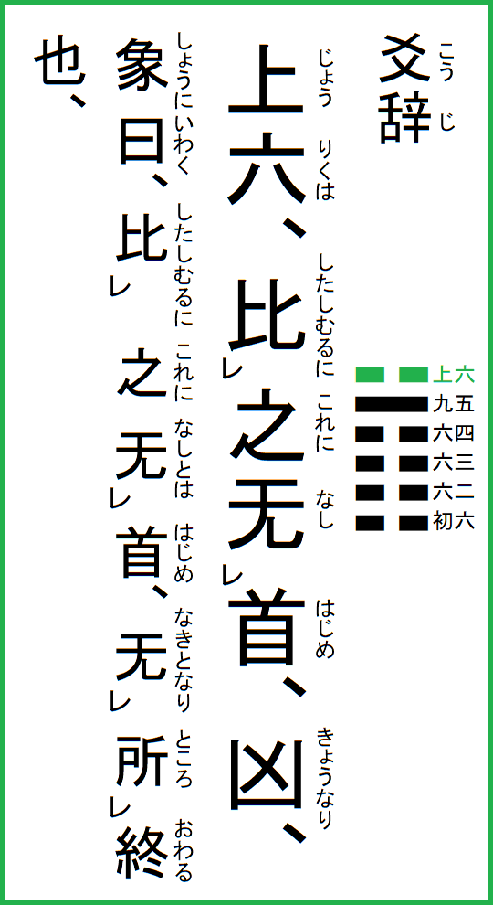 また、上六の爻も九五と比の位に当たっているわけだが、これも、九五の一陽爻と陰陽相比しているという点では、咎のない者である。