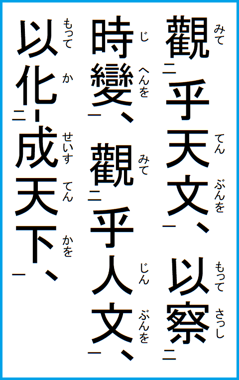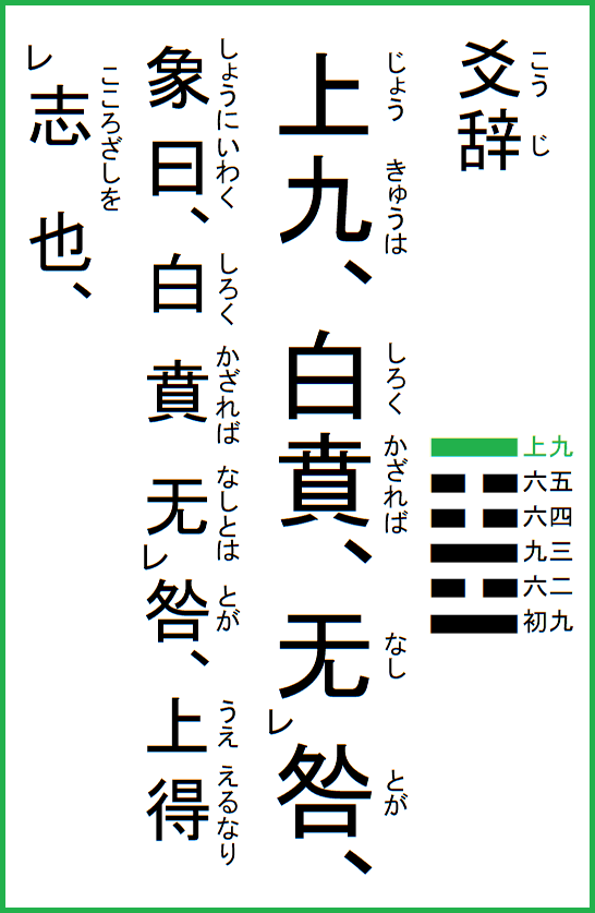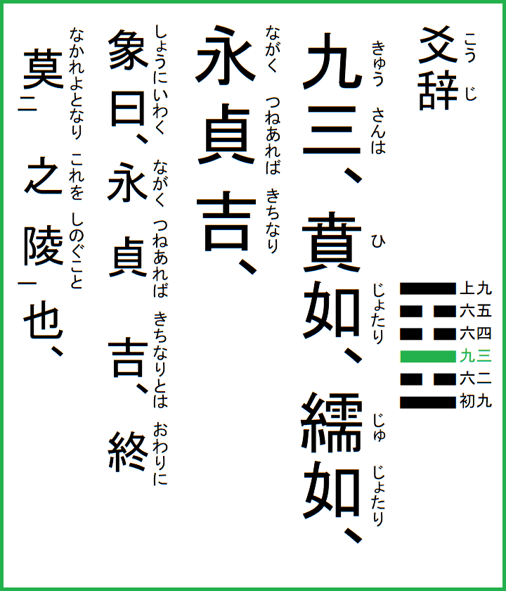 究極の易経解説 メニュー 01.乾為天 02.坤為地 03.水雷屯 04.山水蒙 05.水天需 06.天水訟 07.地水師 08.水地比 09.風天小畜 10.天沢履 11.地天泰 12.天地否 13.天火同人 14.火天大有 15.地山謙 16.雷地予 17.沢雷随 18.山風蠱 19.地沢臨 20.風地観 21.火雷噬嗑 22.山火賁 23.山地剥 24.地雷復 25.天雷无妄 26.山天大畜 27.山雷頤 28.沢風大過 29.坎為水 30.離為火 31.沢山咸 32.雷風恒 33.天山遯 34.雷天大壮 35.火地晋 36.地火明夷 37.風火家人 38.火沢睽 39.水山蹇 40.雷水解 41.山沢損 42.風雷益 43.沢天夬 44.天風姤 45.沢地萃 46.地風升 47.沢水困 48.水風井 49.沢火革 50.火風鼎 51.震為雷 52.艮為山 53.風山漸 54.雷沢帰妹 55.雷火豊 56.火山旅 57.巽為風 58.兌為沢 59.風水渙 60.水沢節 61.風沢中孚 62.雷山小過 63.水火既済 64.火水未済 |