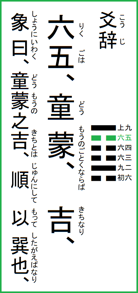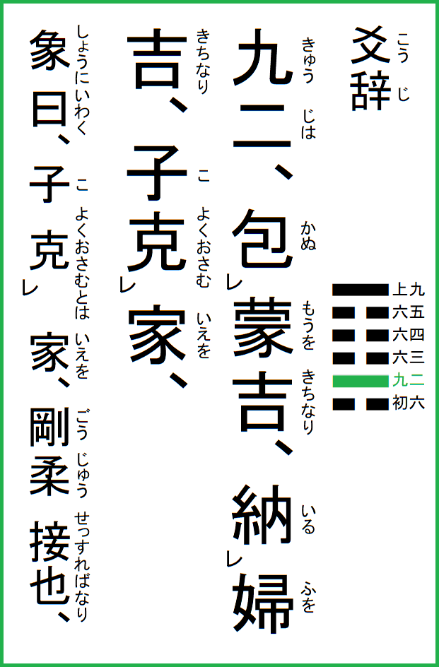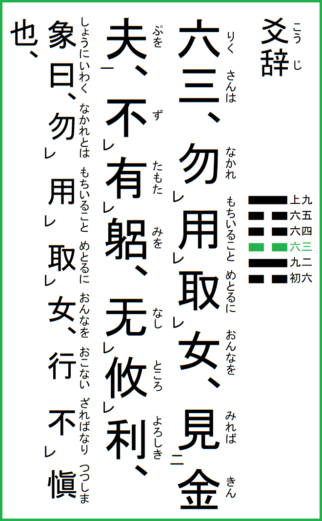 究極の易経解説 メニュー 01.乾為天 02.坤為地 03.水雷屯 04.山水蒙 05.水天需 06.天水訟 07.地水師 08.水地比 09.風天小畜 10.天沢履 11.地天泰 12.天地否 13.天火同人 14.火天大有 15.地山謙 16.雷地予 17.沢雷随 18.山風蠱 19.地沢臨 20.風地観 21.火雷噬嗑 22.山火賁 23.山地剥 24.地雷復 25.天雷无妄 26.山天大畜 27.山雷頤 28.沢風大過 29.坎為水 30.離為火 31.沢山咸 32.雷風恒 33.天山遯 34.雷天大壮 35.火地晋 36.地火明夷 37.風火家人 38.火沢睽 39.水山蹇 40.雷水解 41.山沢損 42.風雷益 43.沢天夬 44.天風姤 45.沢地萃 46.地風升 47.沢水困 48.水風井 49.沢火革 50.火風鼎 51.震為雷 52.艮為山 53.風山漸 54.雷沢帰妹 55.雷火豊 56.火山旅 57.巽為風 58.兌為沢 59.風水渙 60.水沢節 61.風沢中孚 62.雷山小過 63.水火既済 64.火水未済 |
