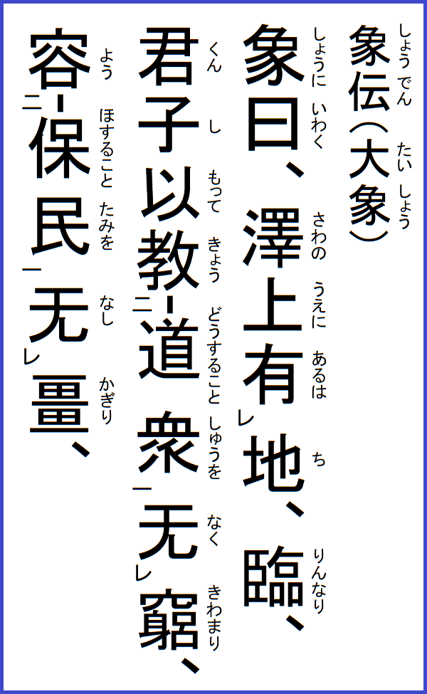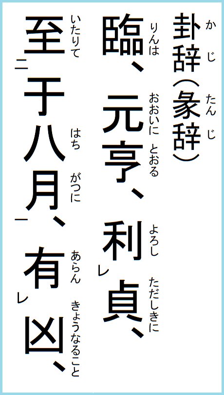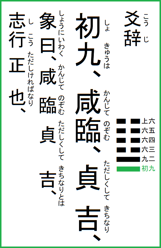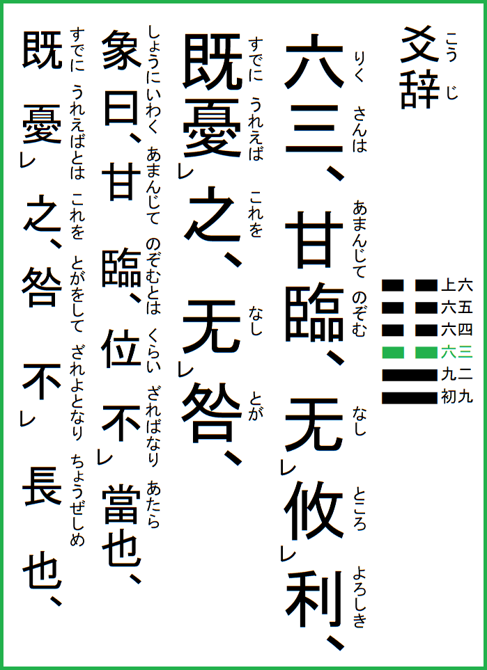 象に曰く、甘んじて臨むとは、位当たらざればなり、既に之を憂えばとは、咎として長ぜしめざれよとなり、