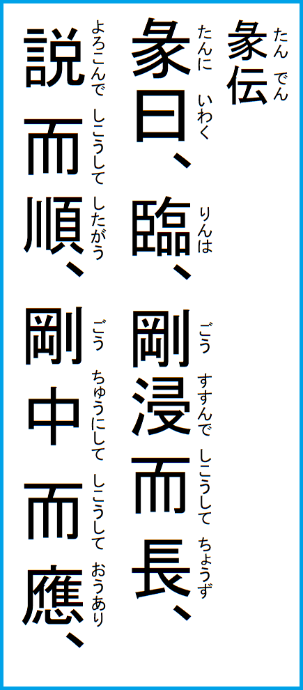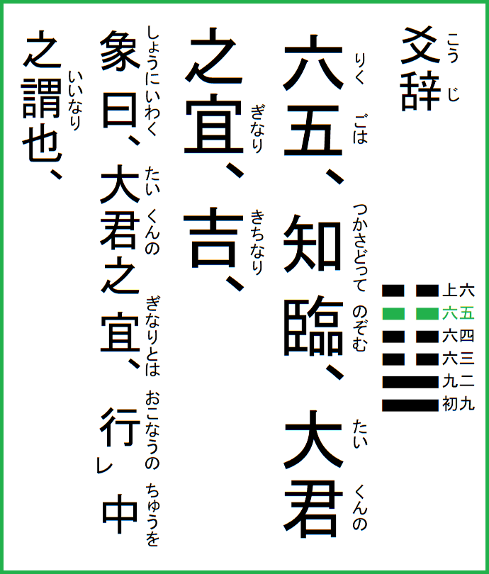 したがって、六五の君上は、よく国政に親しく臨み、よく賢臣を知ってこれを貴び重んじ委ね任せ、また、天下万民に臨むには柔中の仁徳を以ってする。