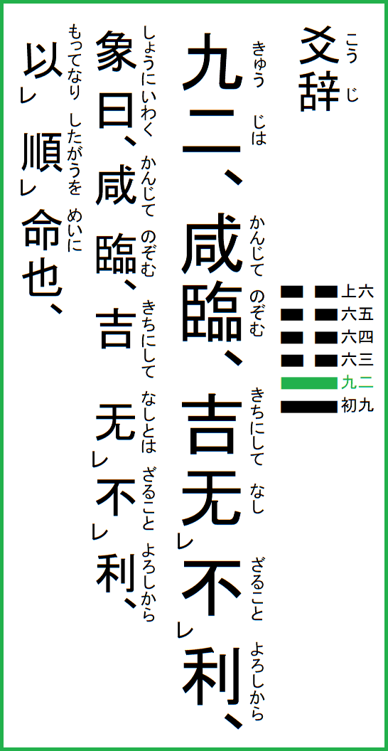 象に曰く、咸じて臨む、吉にして利ろしからざること无しとはも命に順うを以ってなり、