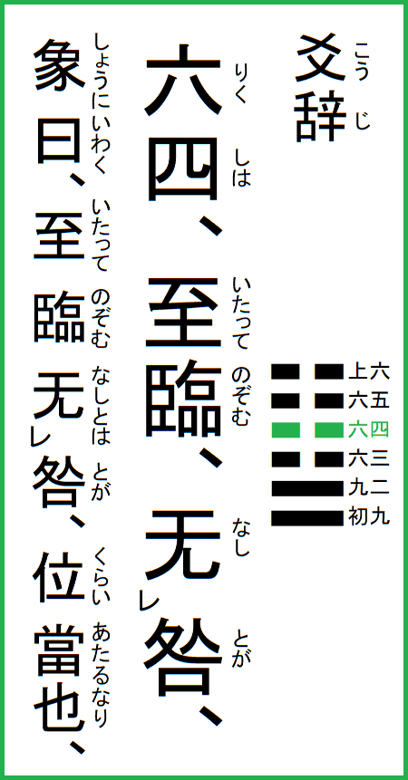 象に曰く、至って臨む咎无しとは、位当たるなり、
