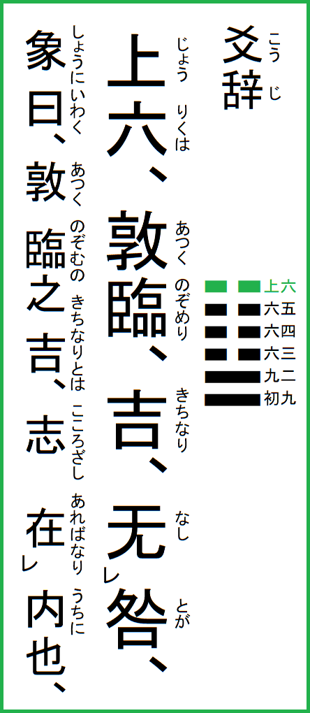 象に曰く、敦く臨むの吉なりとは、志内に在ればなり、