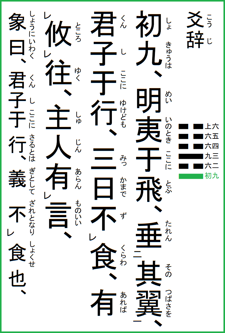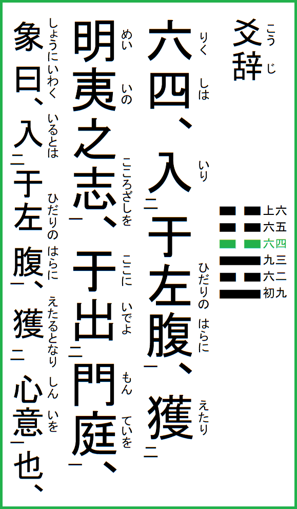 | 究極の易経解説 メニュー 01.乾為天 02.坤為地 03.水雷屯 04.山水蒙 05.水天需 06.天水訟 07.地水師 08.水地比 09.風天小畜 10.天沢履 11.地天泰 12.天地否 13.天火同人 14.火天大有 15.地山謙 16.雷地予 17.沢雷随 18.山風蠱 19.地沢臨 20.風地観 21.火雷噬嗑 22.山火賁 23.山地剥 24.地雷復 25.天雷无妄 26.山天大畜 27.山雷頤 28.沢風大過 29.坎為水 30.離為火 31.沢山咸 32.雷風恒 33.天山遯 34.雷天大壮 35.火地晋 36.地火明夷 37.風火家人 38.火沢睽 39.水山蹇 40.雷水解 41.山沢損 42.風雷益 43.沢天夬 44.天風姤 45.沢地萃 46.地風升 47.沢水困 48.水風井 49.沢火革 50.火風鼎 51.震為雷 52.艮為山 53.風山漸 54.雷沢帰妹 55.雷火豊 56.火山旅 57.巽為風 58.兌為沢 59.風水渙 60.水沢節 61.風沢中孚 62.雷山小過 63.水火既済 64.火水未済 |