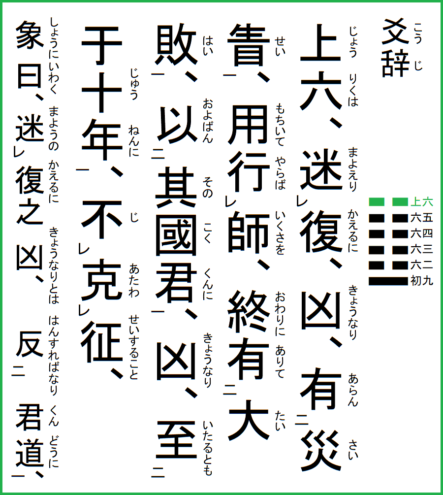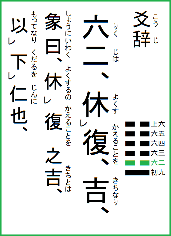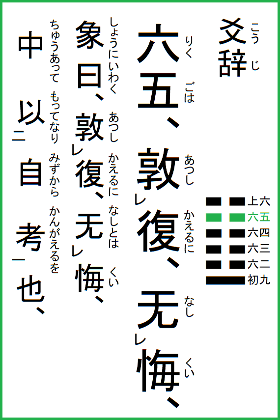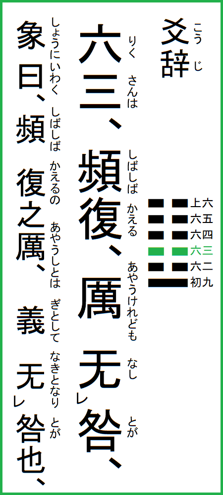 究極の易経解説 メニュー 01.乾為天 02.坤為地 03.水雷屯 04.山水蒙 05.水天需 06.天水訟 07.地水師 08.水地比 09.風天小畜 10.天沢履 11.地天泰 12.天地否 13.天火同人 14.火天大有 15.地山謙 16.雷地予 17.沢雷随 18.山風蠱 19.地沢臨 20.風地観 21.火雷噬嗑 22.山火賁 23.山地剥 24.地雷復 25.天雷无妄 26.山天大畜 27.山雷頤 28.沢風大過 29.坎為水 30.離為火 31.沢山咸 32.雷風恒 33.天山遯 34.雷天大壮 35.火地晋 36.地火明夷 37.風火家人 38.火沢睽 39.水山蹇 40.雷水解 41.山沢損 42.風雷益 43.沢天夬 44.天風姤 45.沢地萃 46.地風升 47.沢水困 48.水風井 49.沢火革 50.火風鼎 51.震為雷 52.艮為山 53.風山漸 54.雷沢帰妹 55.雷火豊 56.火山旅 57.巽為風 58.兌為沢 59.風水渙 60.水沢節 61.風沢中孚 62.雷山小過 63.水火既済 64.火水未済 |