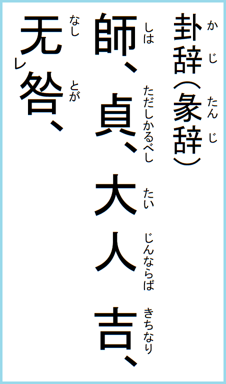 師に在りてとは、軍隊にいること、中なればとは剛中の徳があること、吉とは敵に勝ち国土を治め得ることを言う。