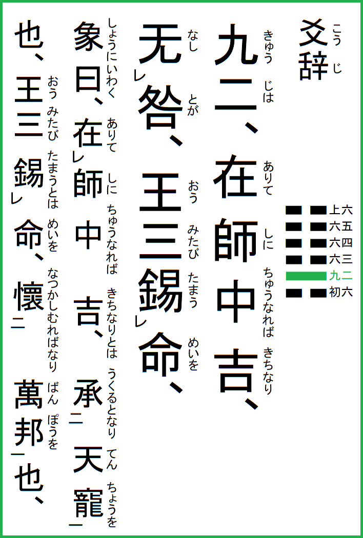九二は、師に在りて中なれば吉なり、咎无し、王三たび命を錫う、