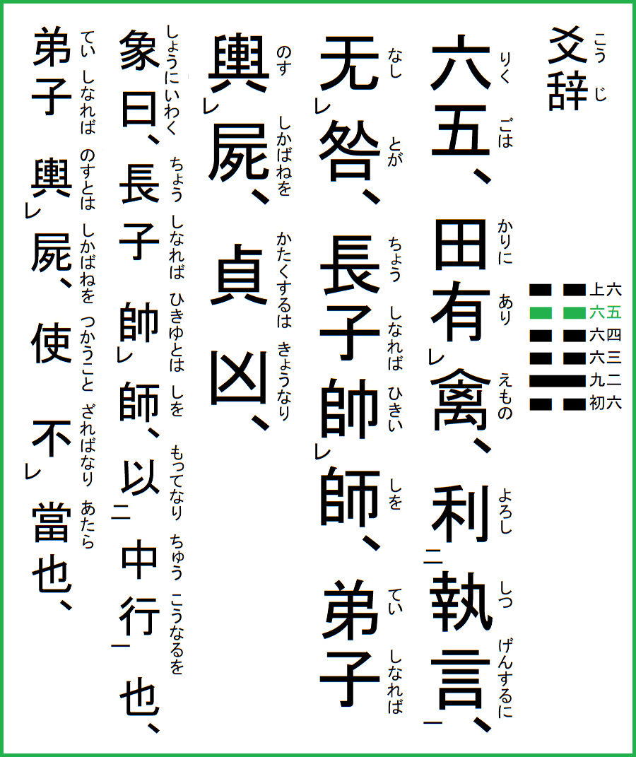 六五は、田に禽有り、執言するに利ろし、咎无し、長子なれば師を帥い、弟子なれば屍を輿す、貞くすれば凶なり、