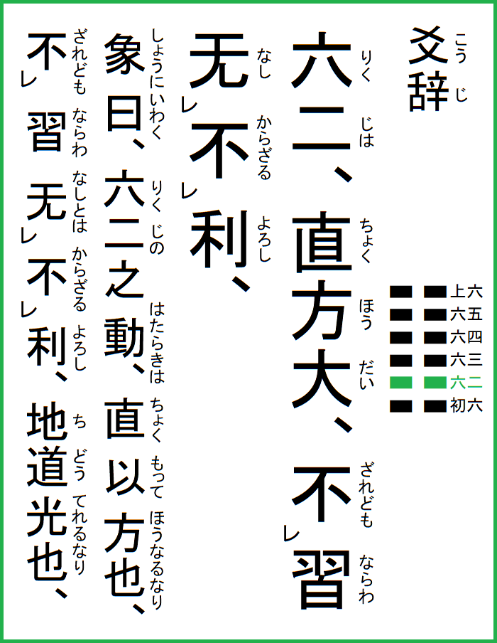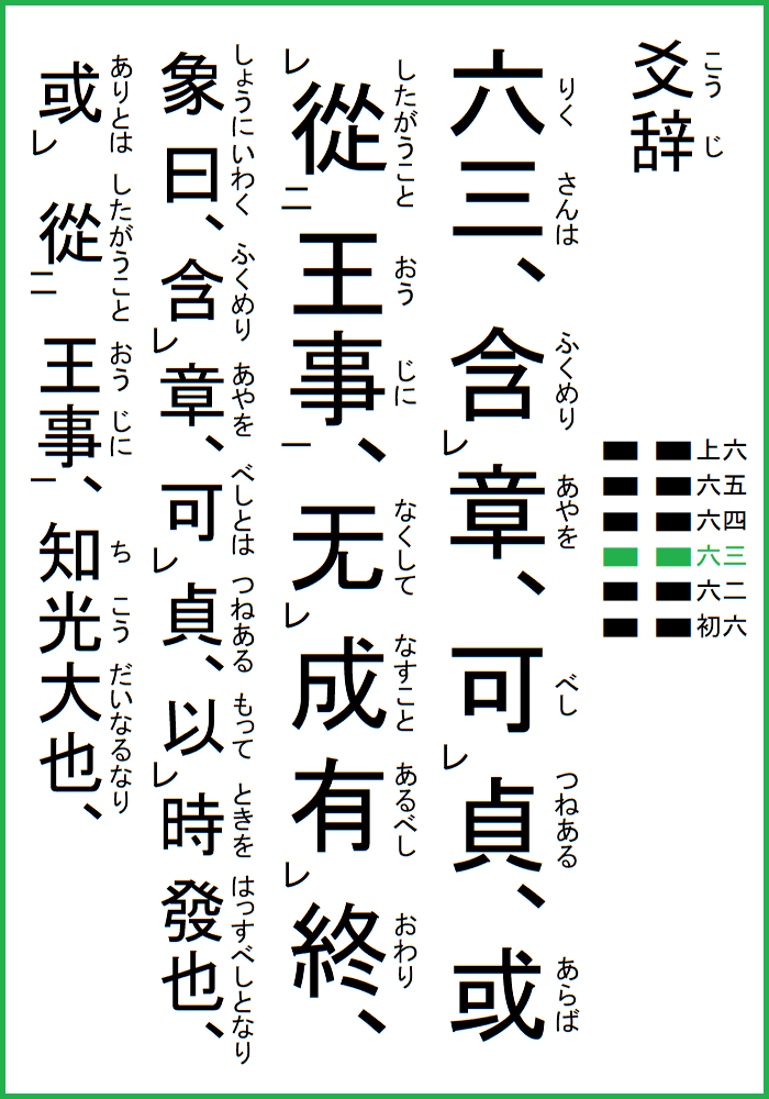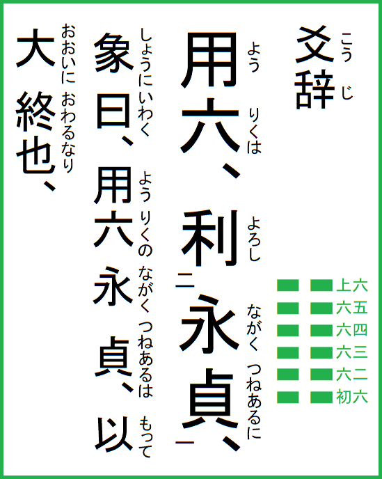 究極の易経解説 メニュー 01.乾為天 02.坤為地 03.水雷屯 04.山水蒙 05.水天需 06.天水訟 07.地水師 08.水地比 09.風天小畜 10.天沢履 11.地天泰 12.天地否 13.天火同人 14.火天大有 15.地山謙 16.雷地予 17.沢雷随 18.山風蠱 19.地沢臨 20.風地観 21.火雷噬嗑 22.山火賁 23.山地剥 24.地雷復 25.天雷无妄 26.山天大畜 27.山雷頤 28.沢風大過 29.坎為水 30.離為火 31.沢山咸 32.雷風恒 33.天山遯 34.雷天大壮 35.火地晋 36.地火明夷 37.風火家人 38.火沢睽 39.水山蹇 40.雷水解 41.山沢損 42.風雷益 43.沢天夬 44.天風姤 45.沢地萃 46.地風升 47.沢水困 48.水風井 49.沢火革 50.火風鼎 51.震為雷 52.艮為山 53.風山漸 54.雷沢帰妹 55.雷火豊 56.火山旅 57.巽為風 58.兌為沢 59.風水渙 60.水沢節 61.風沢中孚 62.雷山小過 63.水火既済 64.火水未済 |