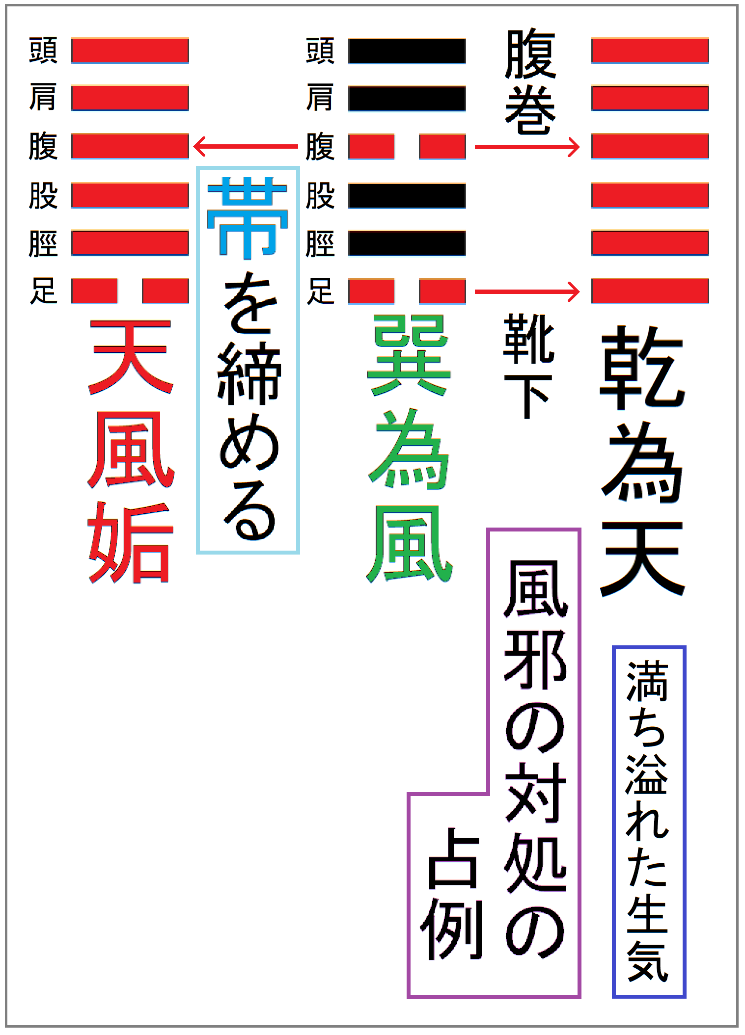 例えば、寝るときに腹と足先が出ていることが原因だとして、帯ではなく腹巻きと言い、足も陰から陽に変じさせるために靴下を穿いて寝ることだ、そうすれば全部が⚊で健やかな䷀乾為天の状態になる、といった判断になる。