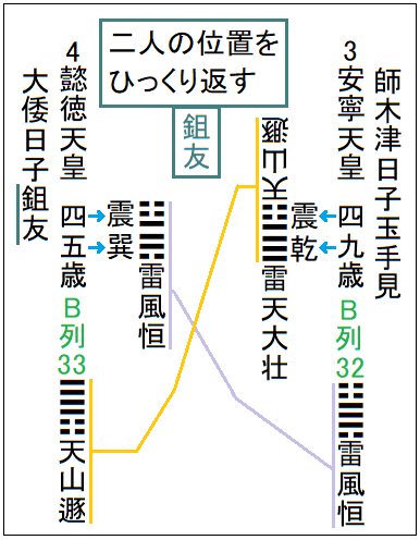 逆に懿徳天皇の古事記による崩御時の年令は四五歳とあるが、四は☳震(雷)、五は☴巽(風)だから、こちらは安寧天皇のB列32䷟雷風恒が示す数字だ。