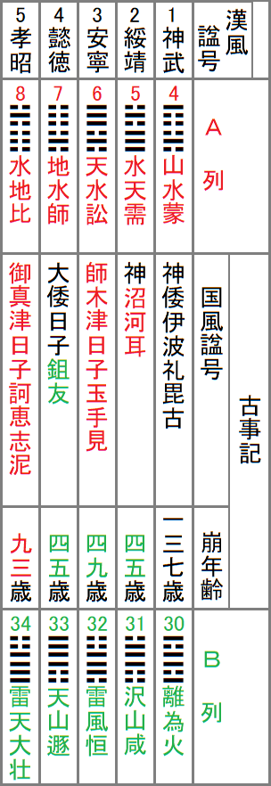 A列を見ると安寧天皇の次すなわち皇位継承者の位置は7䷆地水師、師という卦なのだ。