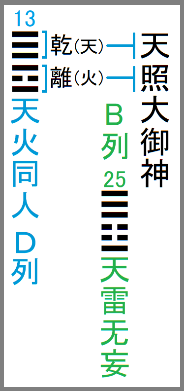 とすると天照大御神という名前は、B列の25䷘天雷无妄と三種の神器を示すと同時に、この13䷌天火同人も併せて示すように考案されたのであって、この位置を13䷌天火同人とする配列をD列と呼ぶことにした。