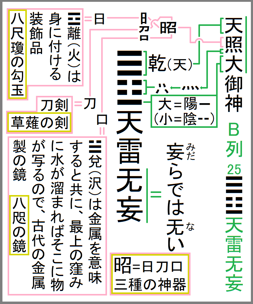 と同時に、天照大の三文字は、天は☰乾(天)、大は小を陰としたときの陽だから一本の陽⚊の記号、照の四つ足は二本の陰⚋の記号と見做せば、天・四つ足・大で、この天雷无妄の形を示していることになる。