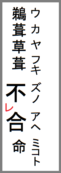 この命以外の神々や天皇の名前は、漢字の訓読あるいは万葉仮名の違いはあるとしても、問題なくそのまま読めるのだが、唯一この命だけは、読むためにはアヘズ=不合という文字の部分に返り点が必要なのだ。