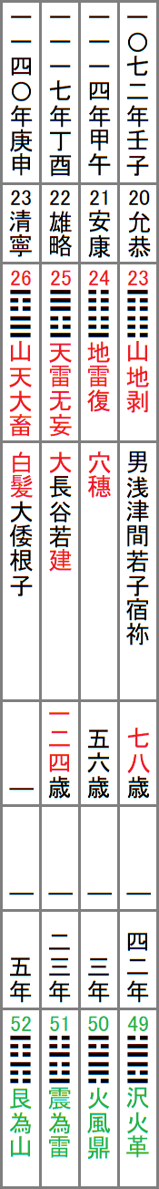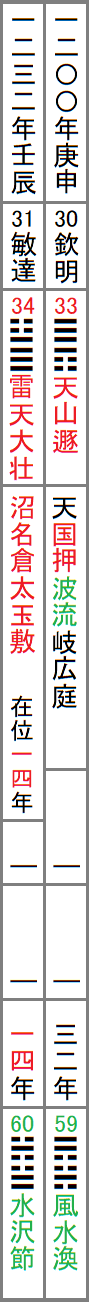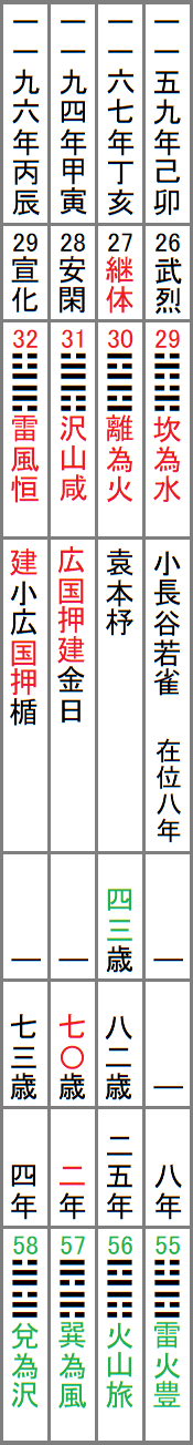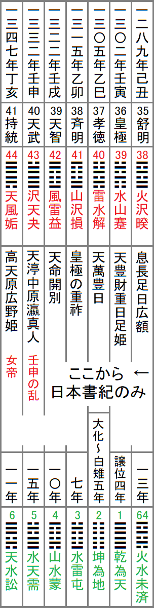 この表は、上から日本書紀による各天皇の即位元年、漢風諡号、A列の卦、古事記による国風諡号、崩御時の年齢、日本書紀による崩御時の年齢、崩年、B列の卦、と並べたもので、赤字の部分はA列と繋がる箇所、緑字の部分はB列と繋がる箇所である。
