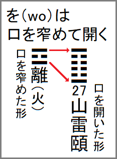 袁(WO)を発音する時は、左図のように、まず口を窄め(☲離(火)の形)、続いて下顎を下げて開く(27䷚山雷頤の形)。