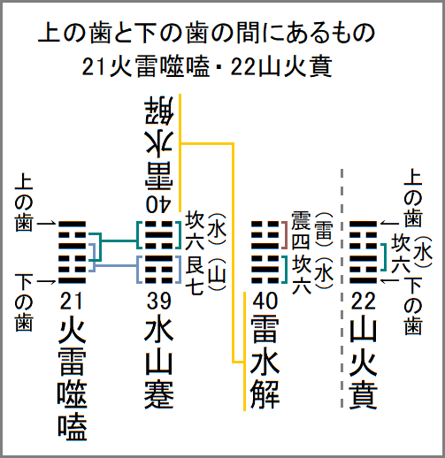 そこで21䷕火雷噬嗑の噬嗑という耳慣れない言葉の意味だが、上下の歯を噛み合わせるという意で、そこから「口の中のものを噛み砕く」という意味を持つのだ。