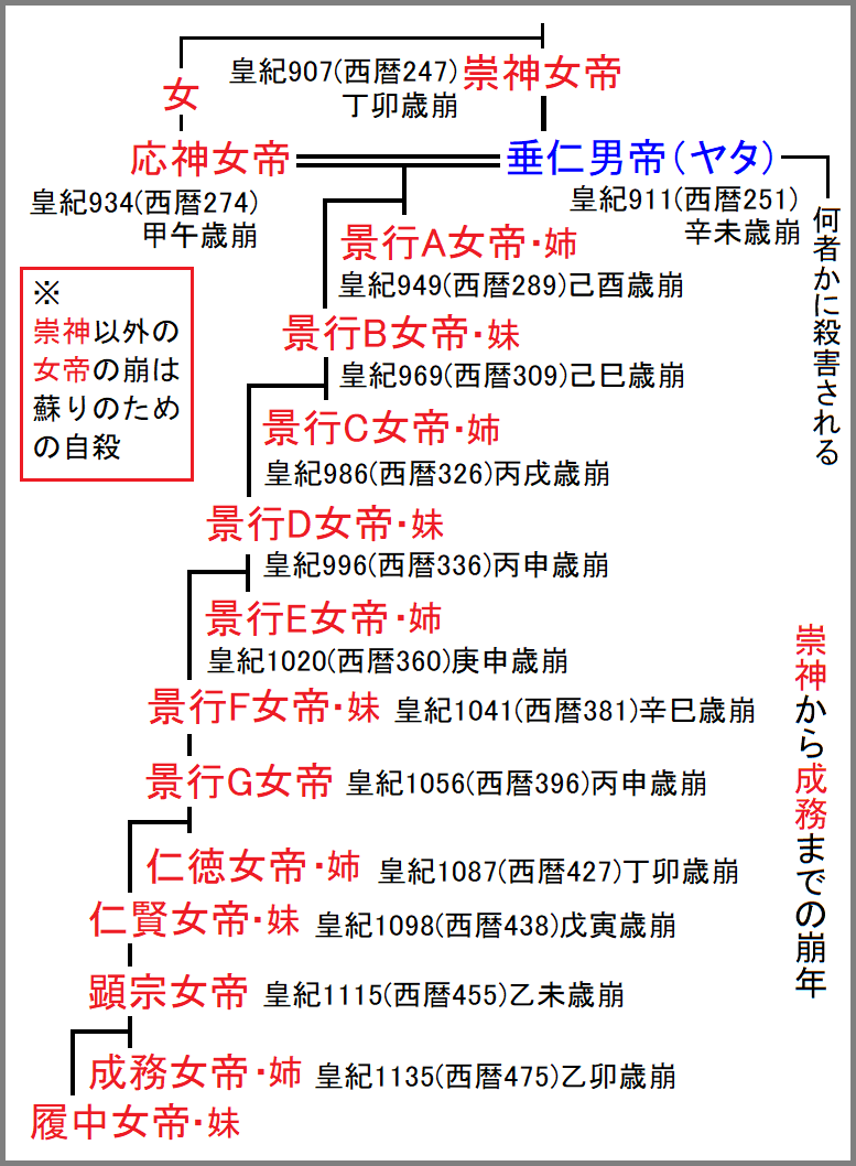 そうこうしているうちに時は経ち、蘇りのための自殺を行わなかった崇神女帝は、目が微かにしか見えない老女となり、ついに、ヤタに後を託して自然死を迎えた。 崇神という漢風諡号は、神を崇め祭るという意だが、これは崇神女帝が、息子ヤタの言うとおりに、神懸りを止め、神をただ崇め祭るだけの存在としたと共に、崩御した崇神女帝のことを忘れず、子孫の心の中に永遠に生き続けさせるために、崇め祭る存在の神とした、ということである。 その崇神女帝が崩御すると、ヤタが日本初の男性の王として即位し、神懸りではなく、仁を垂れて、理性に基づく思いやりを大切する社会にしようとした。