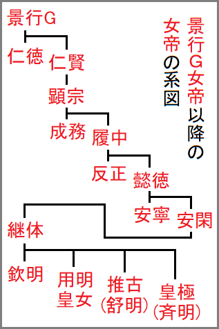 これで、女帝系は最後まで親子関係が明かになったが、これをまとめると左図のようになる。