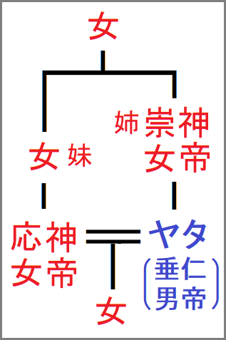 崇神女帝の妹が応神女帝の母親であり、したがって左図のように、応神女帝は垂仁男帝の従兄妹ということになる。