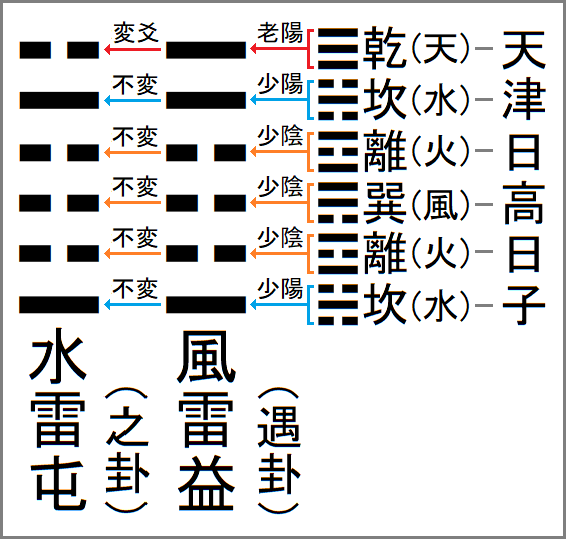 天は☰乾(天)、津は水がある場所のことだから☵坎(水)、日は☲離(火)、高は☴巽(風)、子は十二支の子とすれば☵坎(水)だから、合わせて遇卦42䷷風雷益、之卦3䷂水雷屯となる。