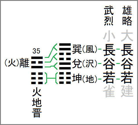 雄略天皇と武烈天皇の国風諡号の共通部分の長谷若を易の卦に置き換えると、長は☴巽(風)・谷は☱兌(沢)・若は☷坤(地)だから、合わせて☴☱☷巽兌坤(風沢地)となり、上の☴☱巽兌(風沢)の部分は記号を二本で一本と見做せば☲離(火)だから、最終的に35䷢火地晋となる。