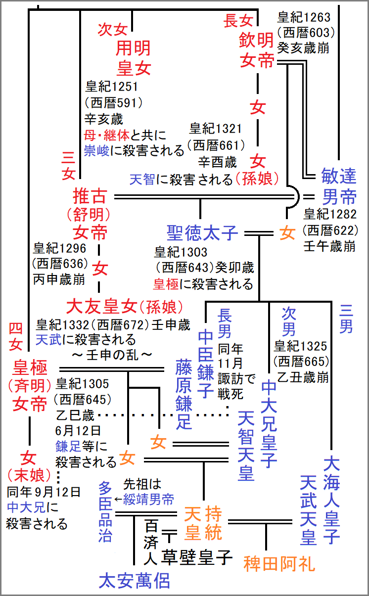 皇紀1296年丙申=西暦636年 女帝側の理屈で言えば、蘇りを繰り返すことで永遠に死なないわけで、妹の皇極女帝は推古女帝の祖母・安閑女帝の蘇りなのだから、聖徳太子よりも皇位継承の順が優先なのは当然のこと。 その聖徳太子は、すでに女帝側と男帝側との繋がりをさらに深めるためにと、欽明女帝の娘との間に三人の男の子を儲けていた。