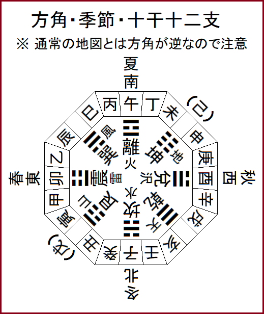 北に配される干支は十二支の子と十干の壬と癸で、このうち方位図を描くときに一番東に配されるのは癸である。