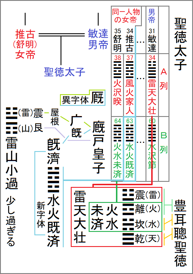 63䷾水火既済は34推古天皇のB列で、表向きの聖徳太子は推古天皇の時代の皇太子として描かれている。