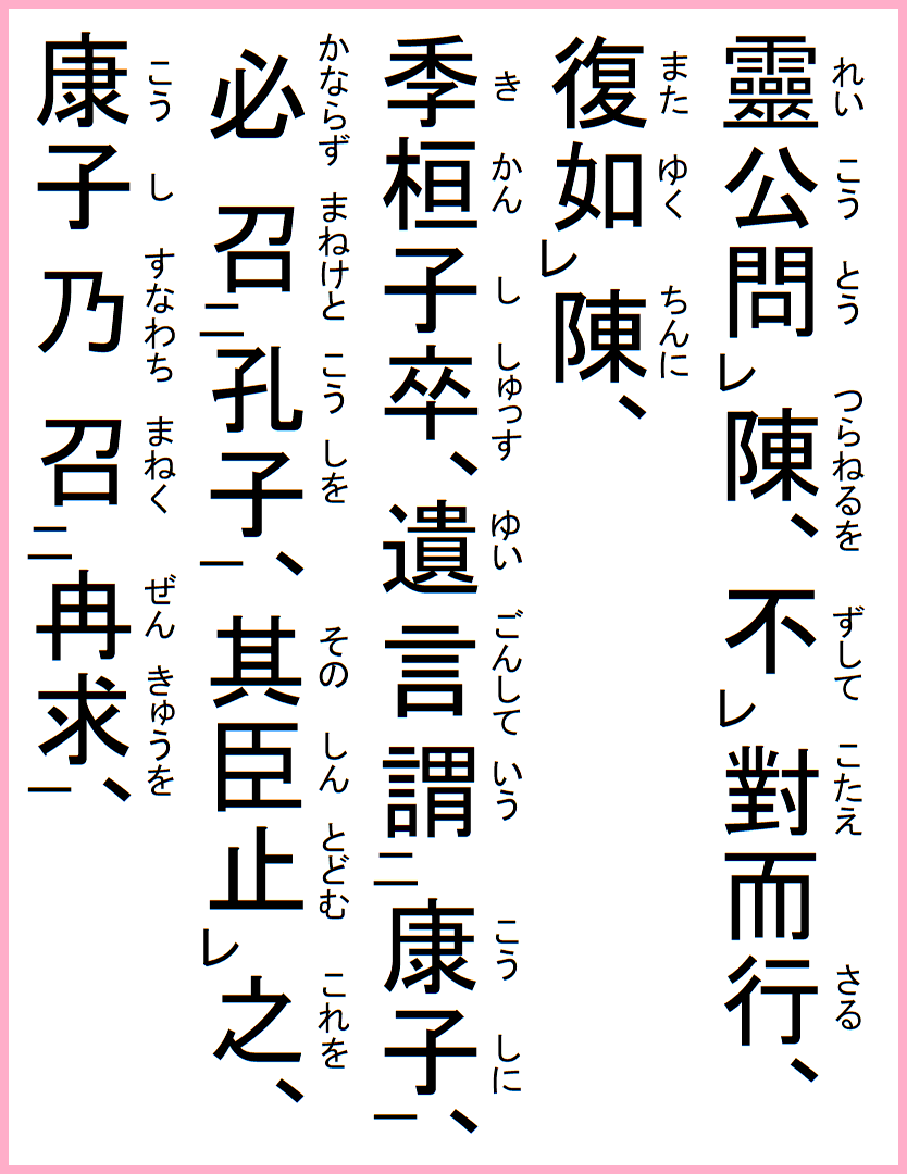 季桓子卒す、遺言して康子に謂う、必ず孔子を召べと、その臣これを止む、康子すなわち冉求を召ぶ、