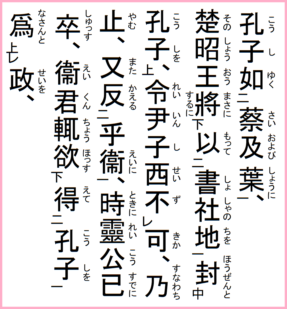 楚の昭王将に書社の地を以って孔子を封ぜんとするに、令尹子西可かず、乃ち止む、