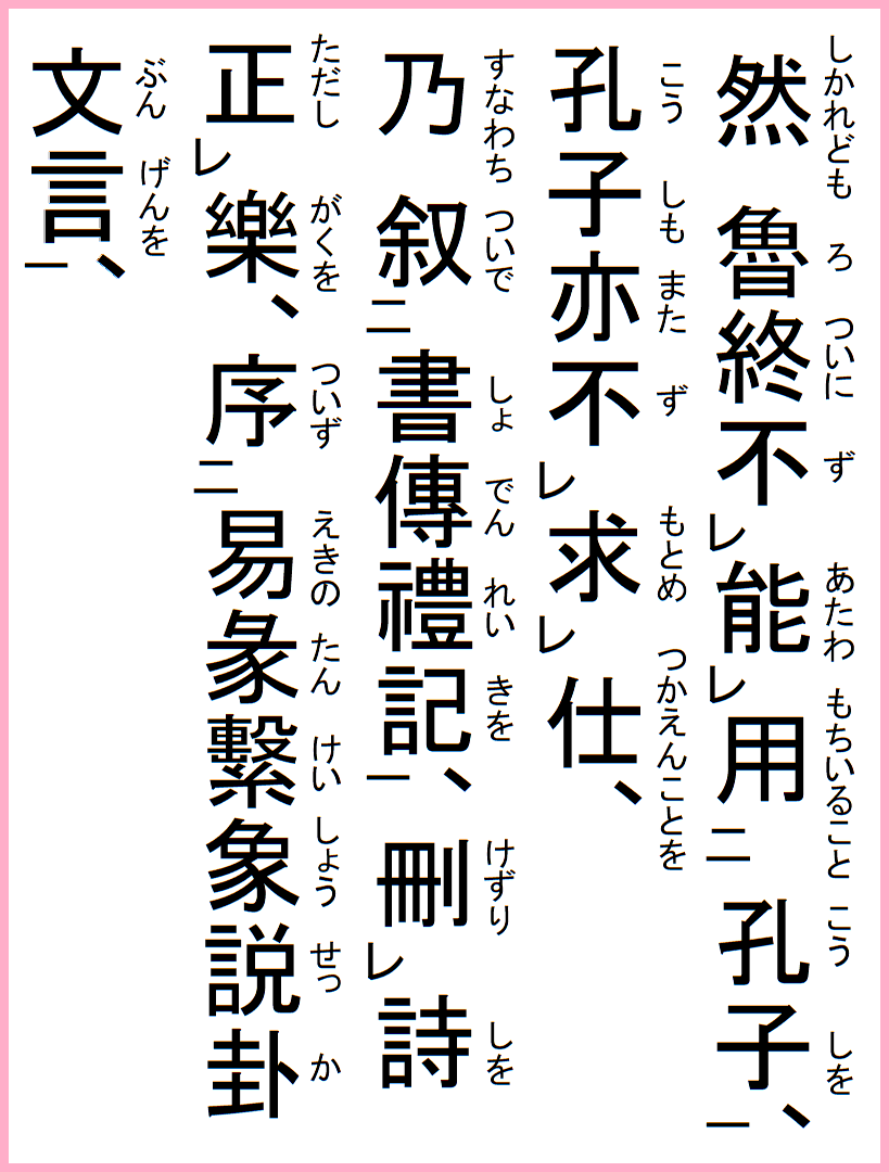 乃ち書伝礼記を叙いで、詩を刪り楽を正し、易の彖繋象説卦文言を序ず、
