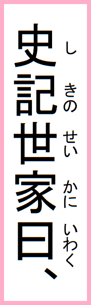 世家とは、その家を世々承け伝えて、国を保った者のことである。孔子は諸侯ではないが、その徳は盛んにして、子孫にも賢者が多いので、これを尊び、列伝に入れず、世家に連ねたのである。