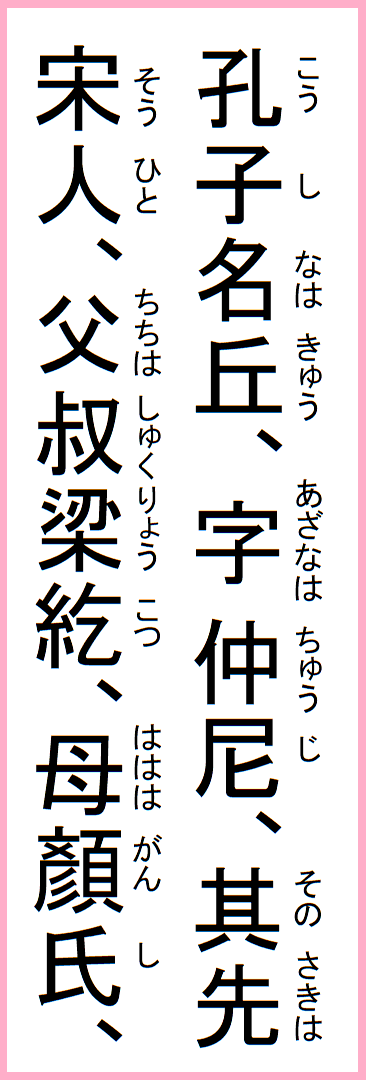 孔子名は丘、字は仲尼、其の先は宋人、父は叔梁紇、母は顔氏、