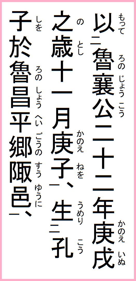 魯の襄公二十二年庚戌之歳十一月庚子を以って、孔子を魯の昌平郷の陬邑に生めり、